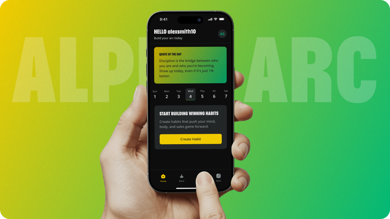 Alpha Arc is a productivity and wellness app for sales reps, combining habit tracking, meditation, sales training, and team management in one platform.